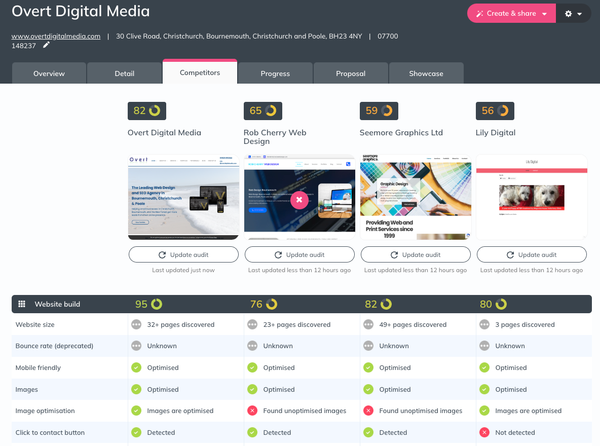 Upgrade to see a side-by-side comparison of your website alongside your competitors and see what you need to do to outrank them in Google for just £49