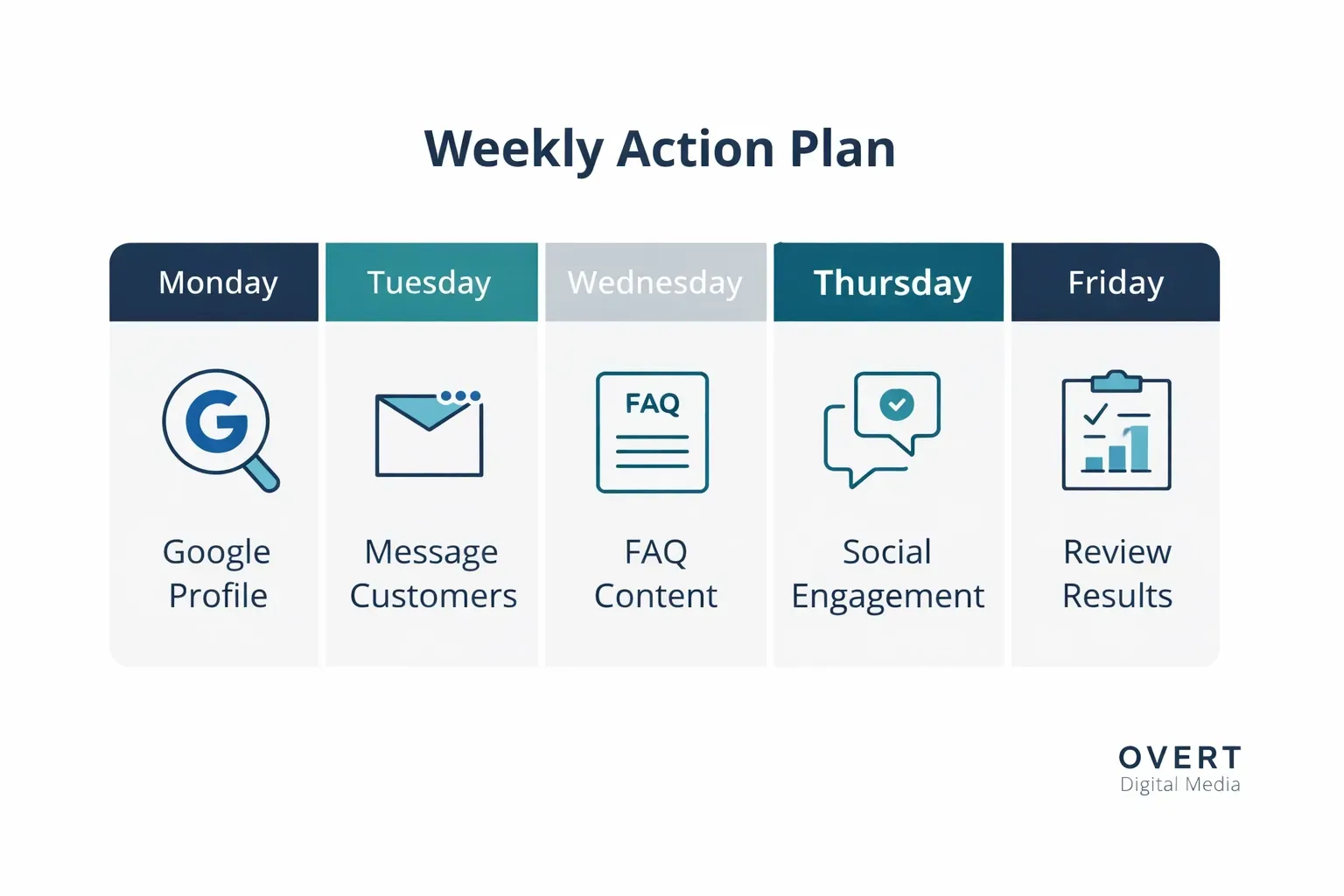 - Monday: Claim or update your Google Business Profile. Add five recent photos and your correct phone number.